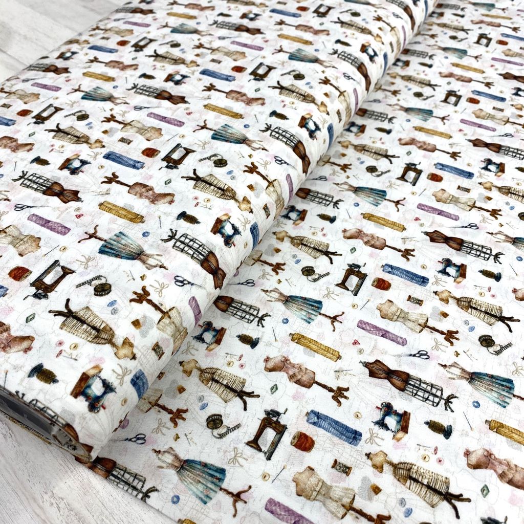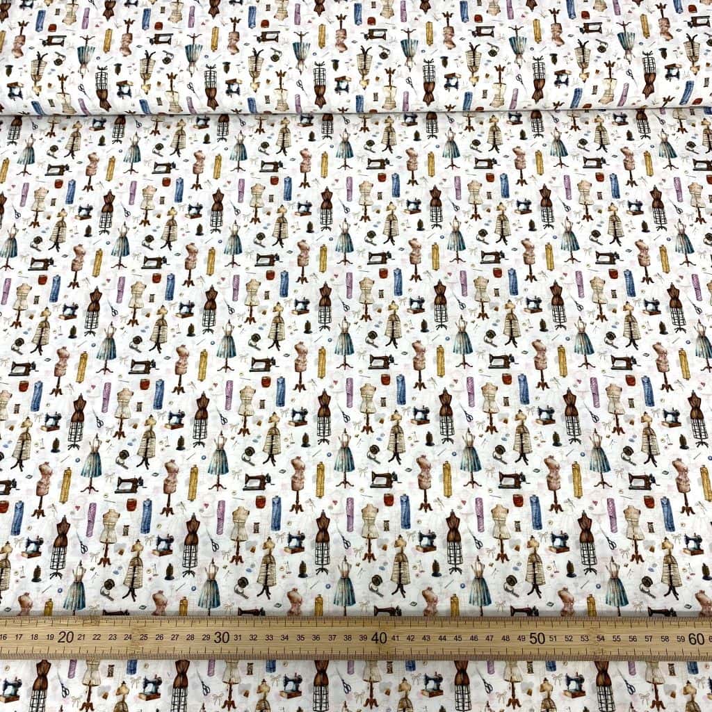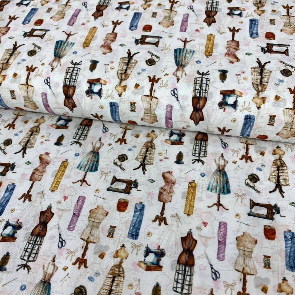 La tela de algodón 100% tipo popelín estampado es ideal para las creatividades de patchwork. Hablamos de un tejido ligero, suave al tacto y muy agradable de trabajar. Perfecto tanto para confección como para proyectos de costura creativa. Este estampado viene con diferentes elementos de costura, máquinas de coser, maniquies, hilos, metros… ideal para la confecciones de apasionadas de la costura.