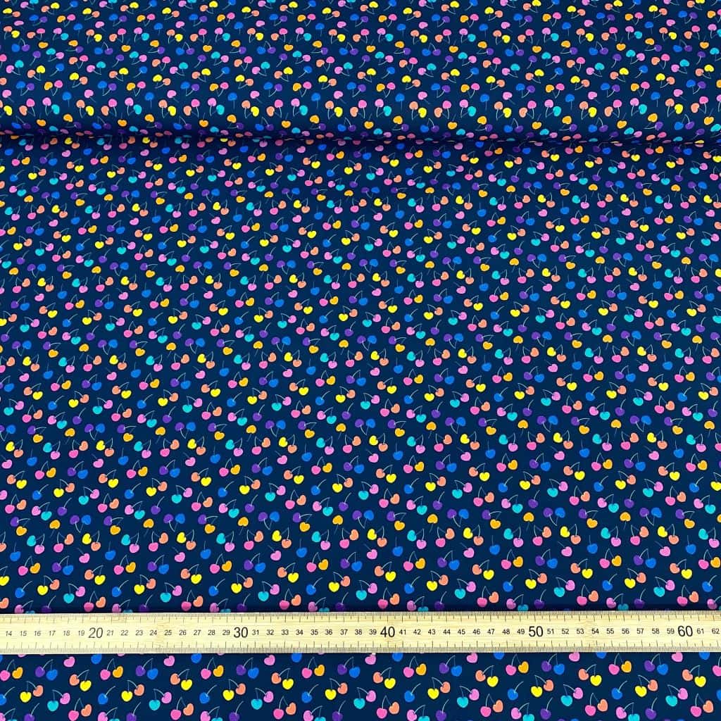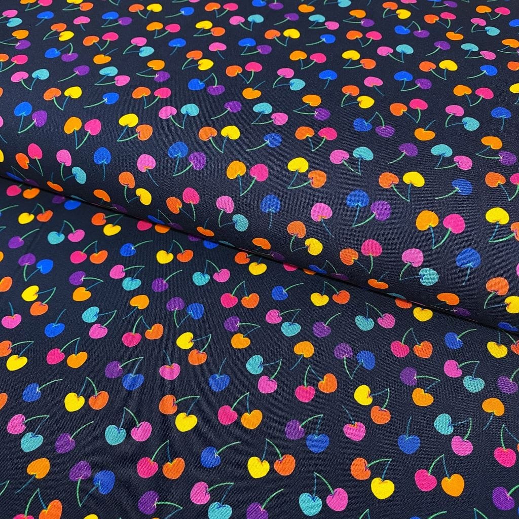 La tela de algodón 100% tipo popelín estampado es ideal para las creatividades de patchwork. Hablamos de un tejido ligero, suave al tacto y muy agradable de trabajar. Perfecto tanto para confección como para proyectos de costura creativa. Este tejido viene con estampado de cerezas de colores azul, rosa, lila, amarillo, con fondo azul marino… ideal para la confecciones de verano y estivales.
