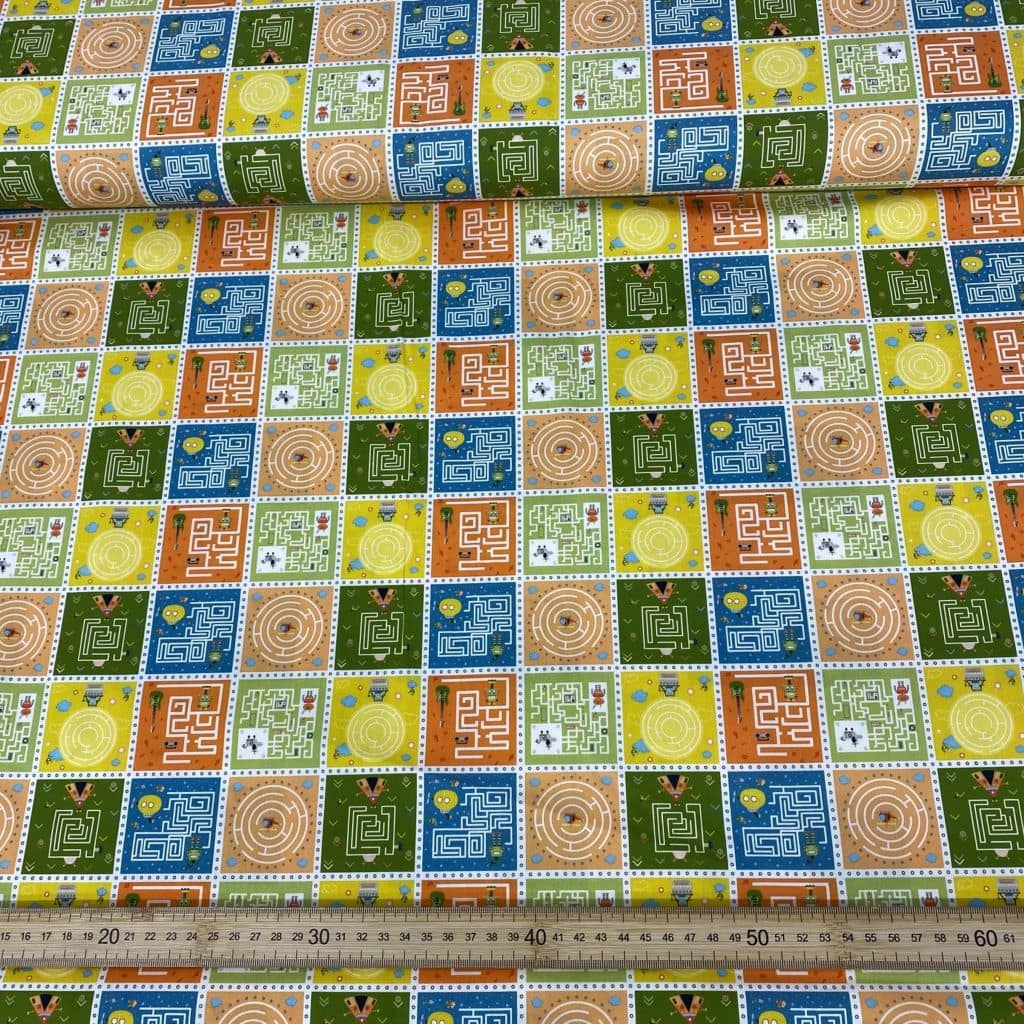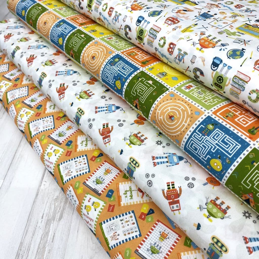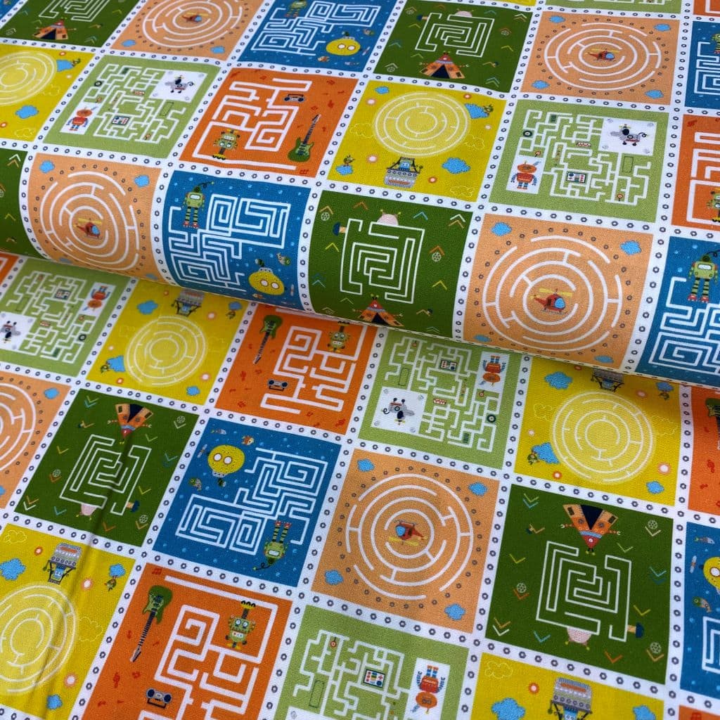 La tela de algodón 100% tipo popelín estampado es ideal para las creatividades de patchwork. Hablamos de un tejido ligero, suave al tacto y muy agradable de trabajar. Perfecto tanto para confección como para proyectos de costura creativa. Este estampado viene con pasatiempos tipo laberintos y robots en tonos naranjas… ideal para la confecciones infantiles y escolares.