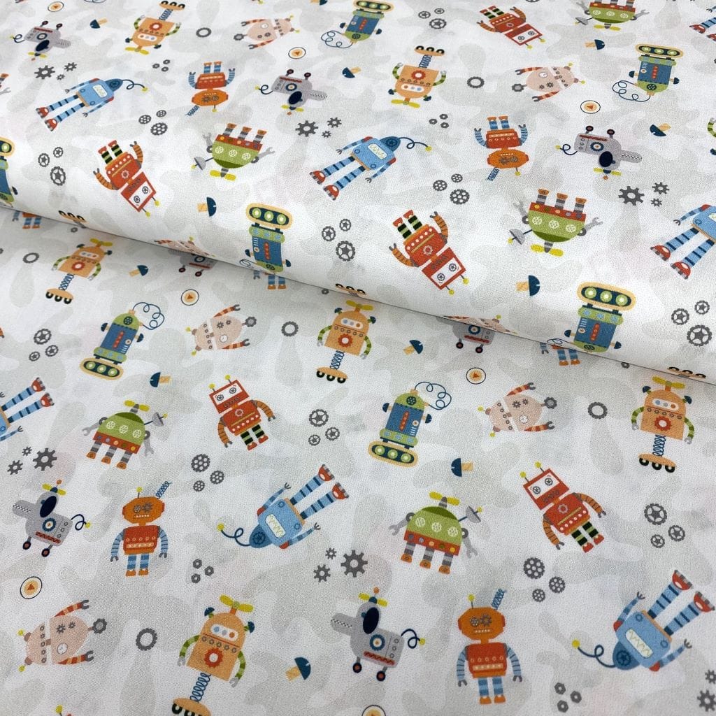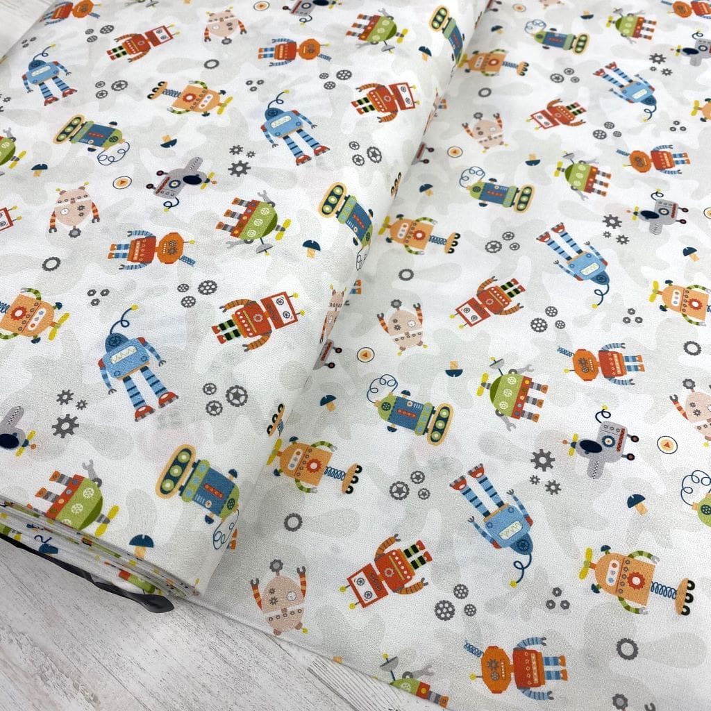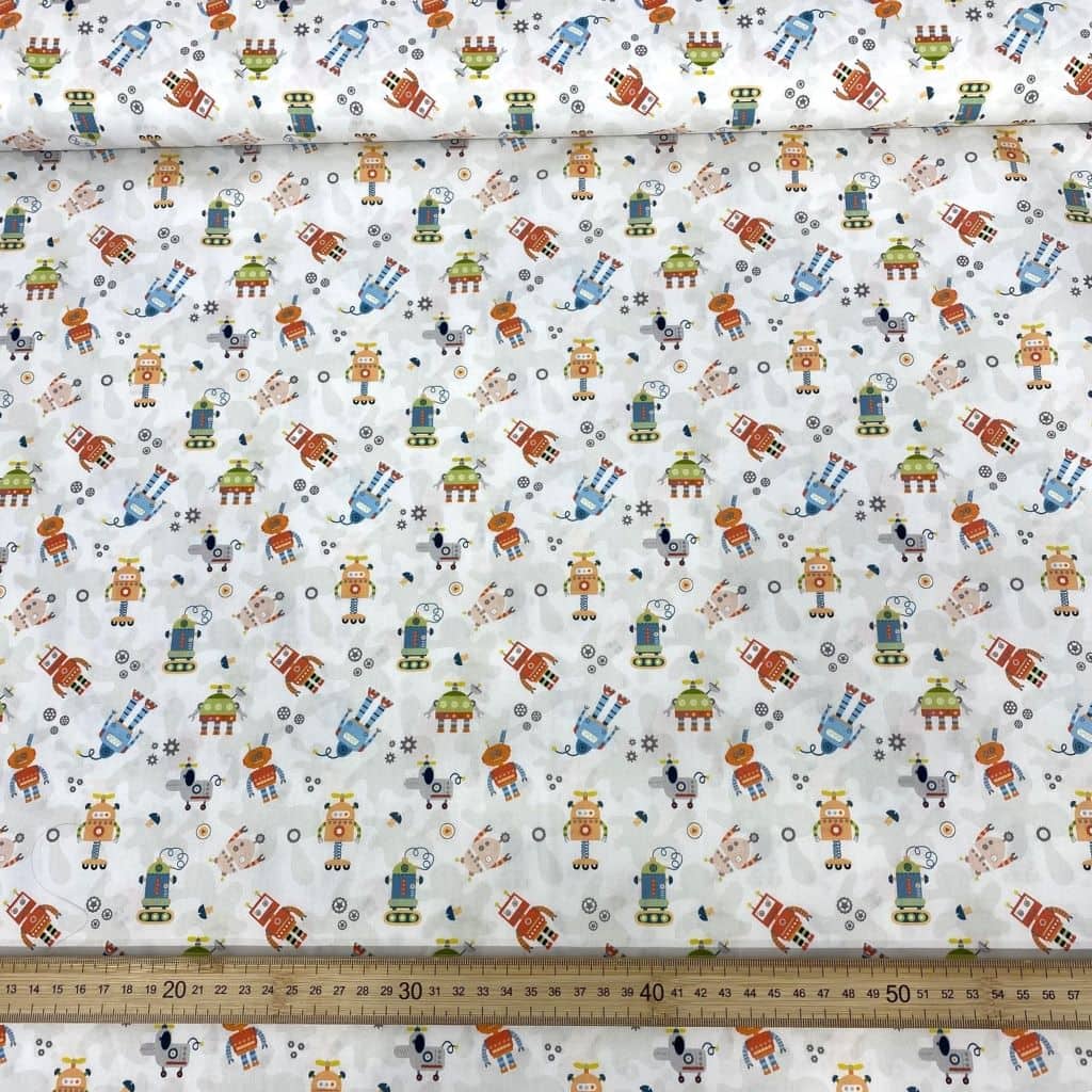 La tela de algodón 100% tipo popelín estampado es ideal para las creatividades de patchwork. Hablamos de un tejido ligero, suave al tacto y muy agradable de trabajar. Perfecto tanto para confección como para proyectos de costura creativa. Este estampado viene con diferentes tipos de robots… ideal para la confecciones infantiles y escolares.