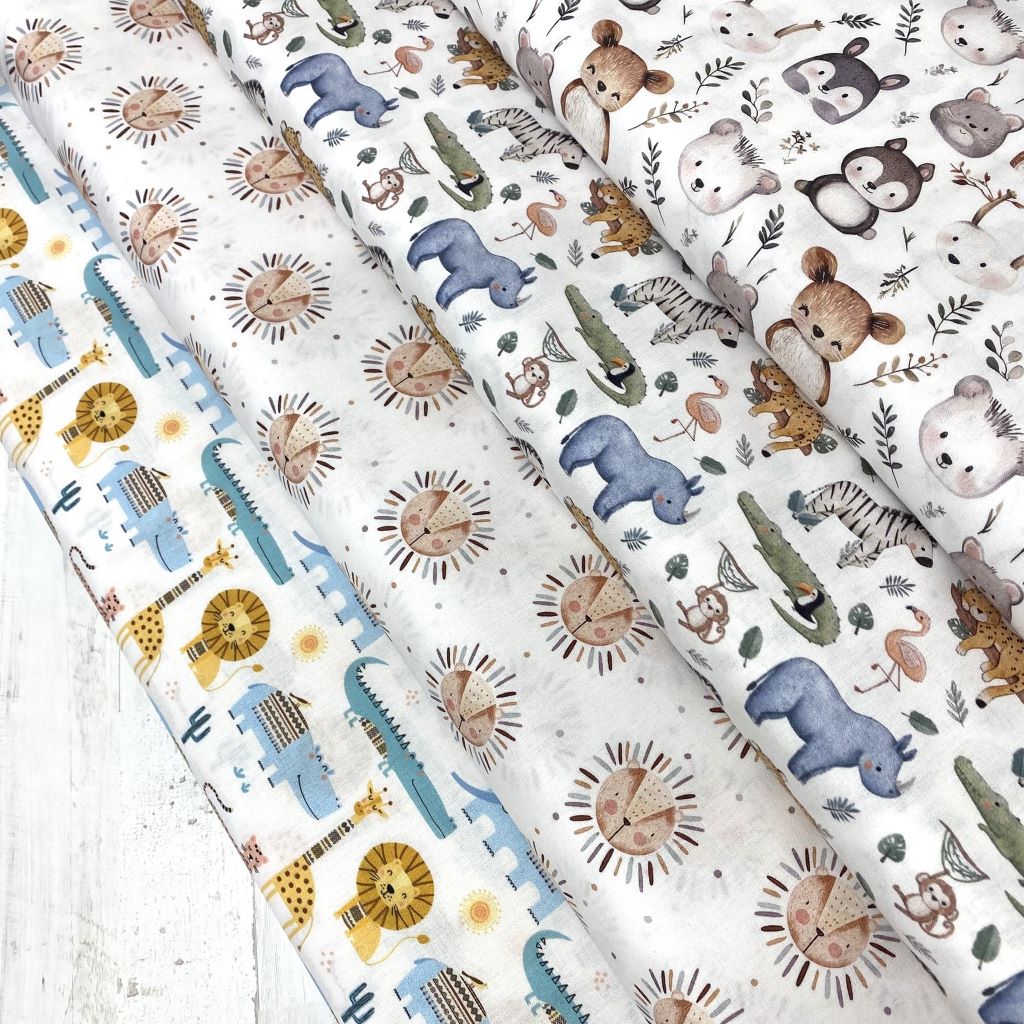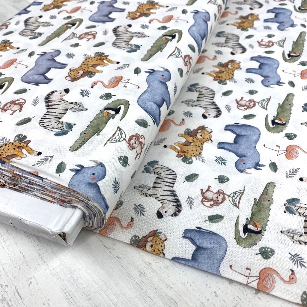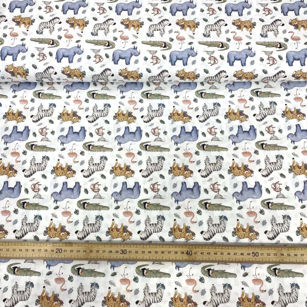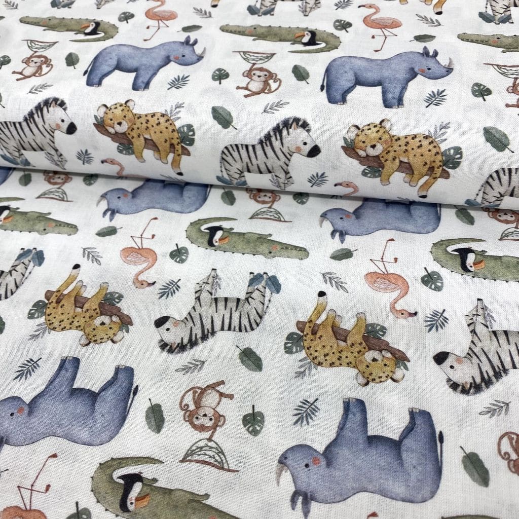 La tela de algodón 100% tipo popelín estampado es ideal para las creatividades de patchwork. Hablamos de un tejido ligero, suave al tacto y muy agradable de trabajar. Perfecto tanto para confección como para proyectos de costura creativa. Este estampado viene con dibujos infantiles de animales de selva como cocodrilos, zebras, tucan, rinoceronte, flamenco, mono, guepardo… ideal para confecciones infantiles de animales.