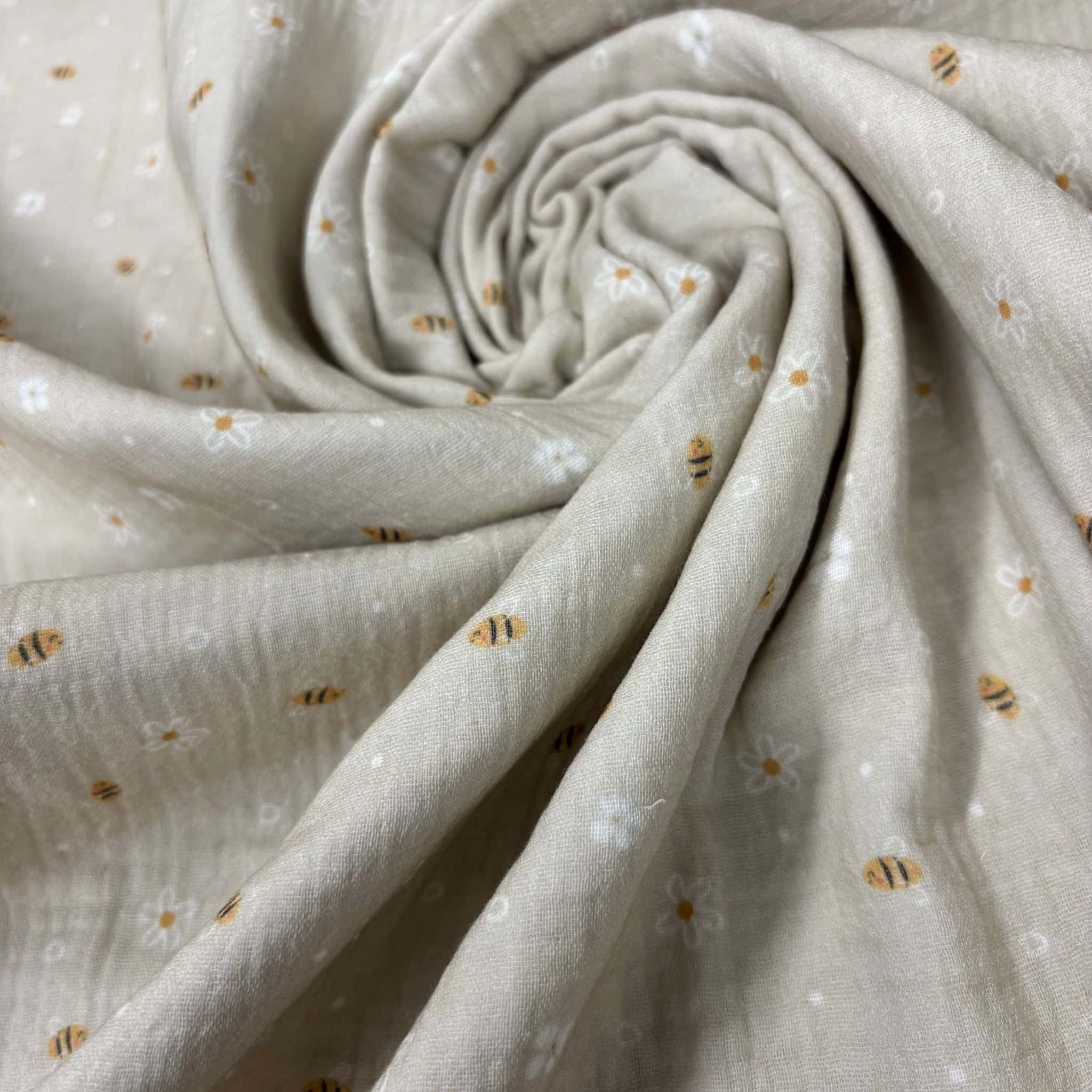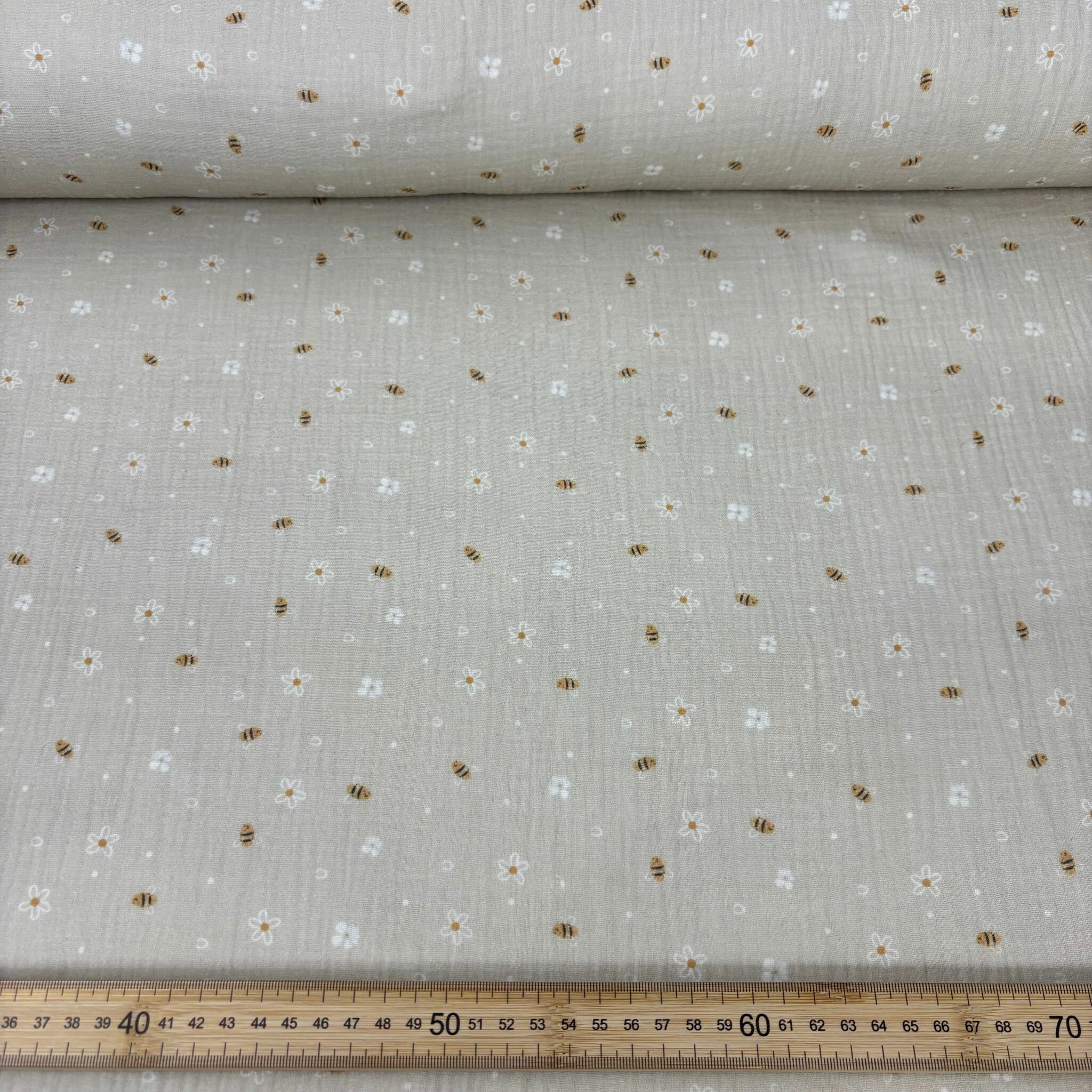 Tela de muselina o de doble gasa de algodón 100%. Viene con un estampado de abejitas y flores con el fondo taupé.