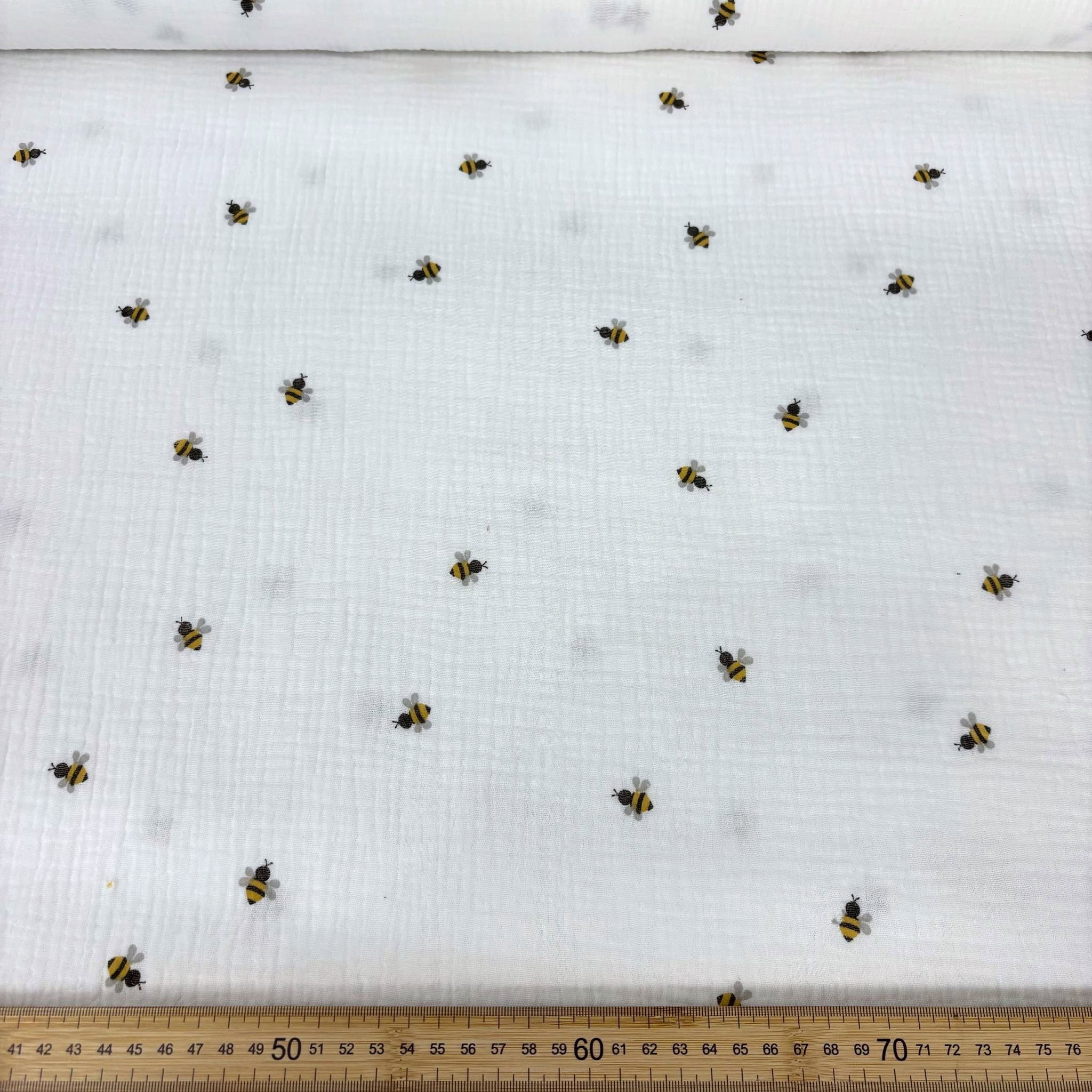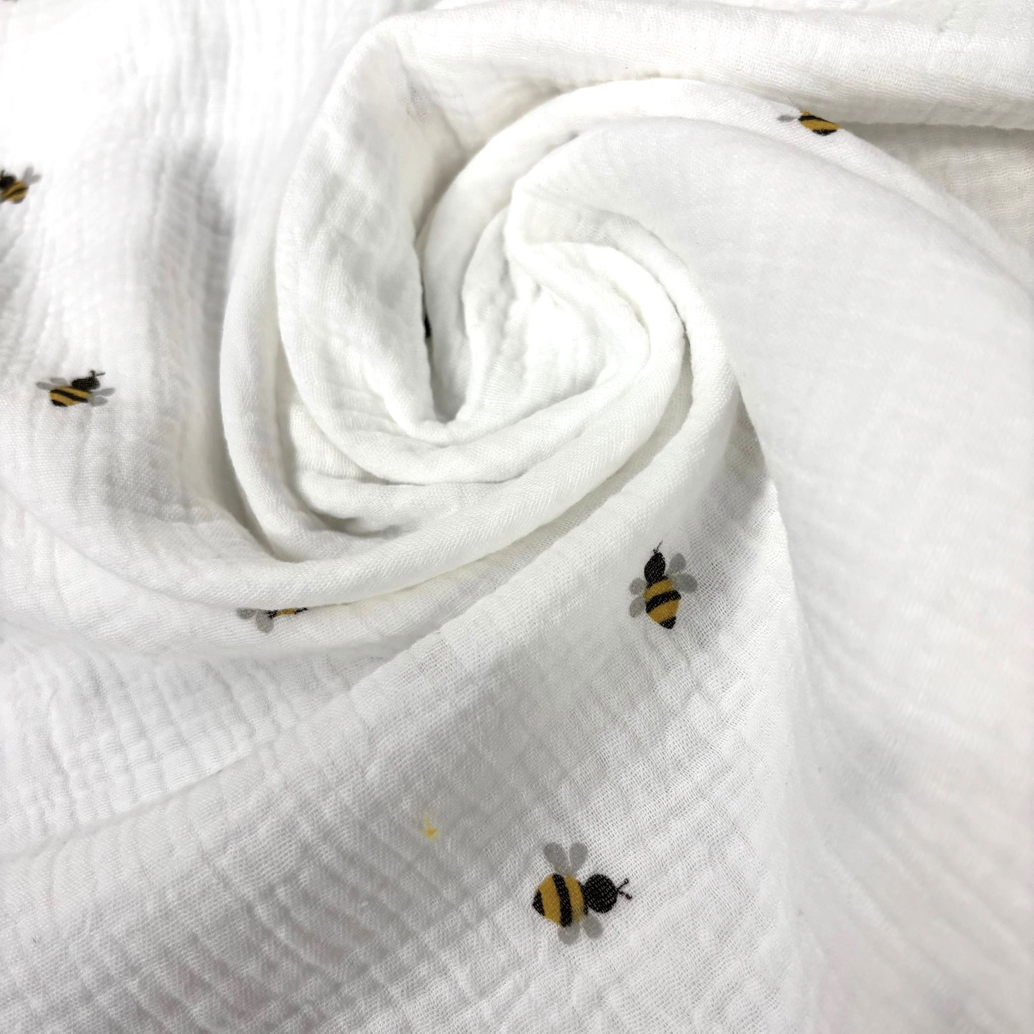 Tela de muselina o de doble gasa de algodón 100%. Viene con un estampado de abejitas con el fondo blanco.