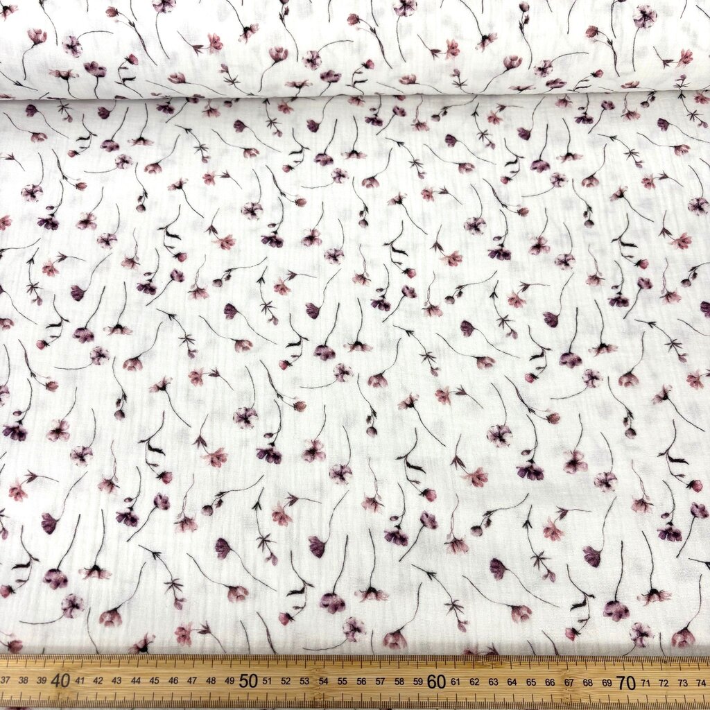 Tela de muselina o de doble gasa de algodón 100%. Viene con un estampado de flores en colores lilas o violetas fondo blanco.