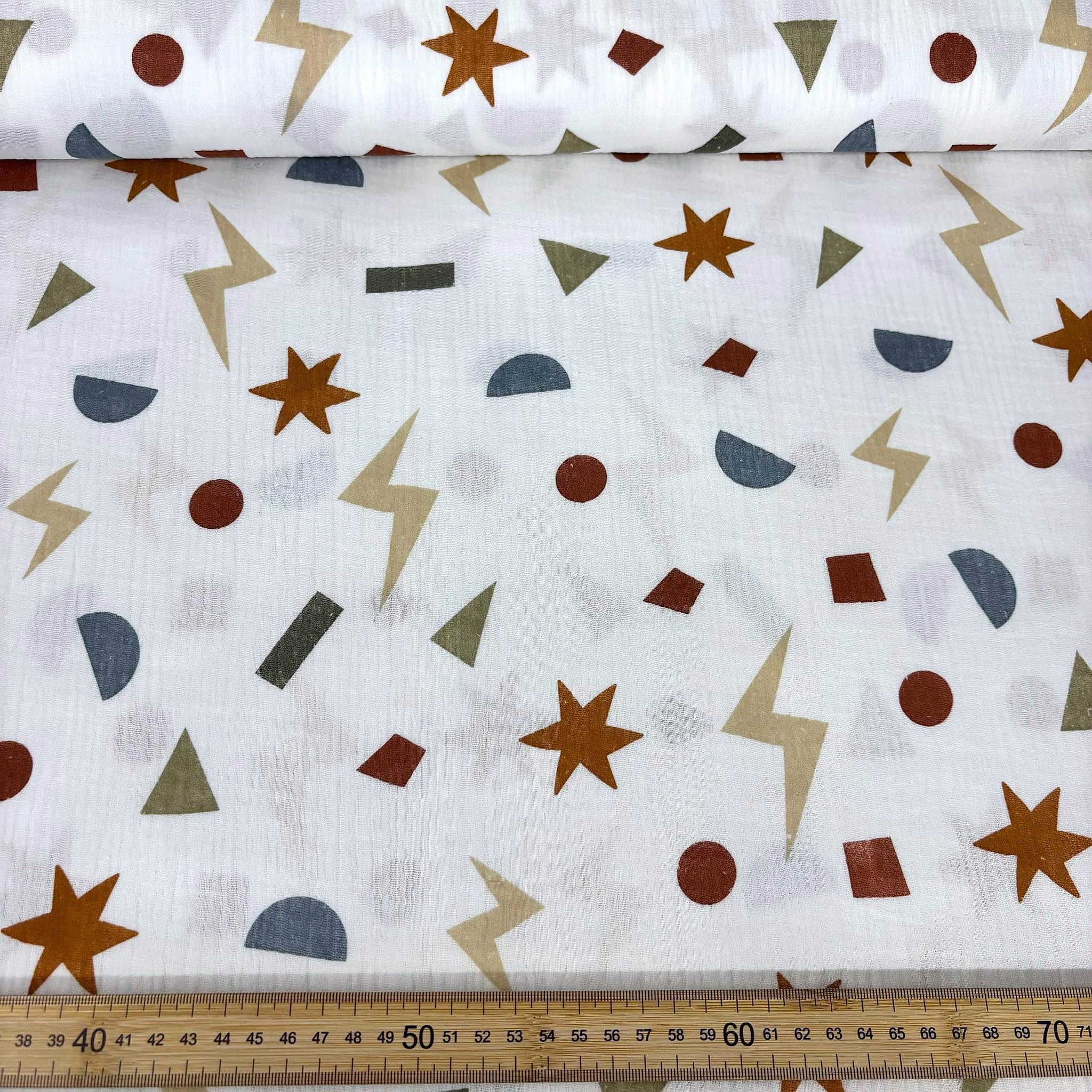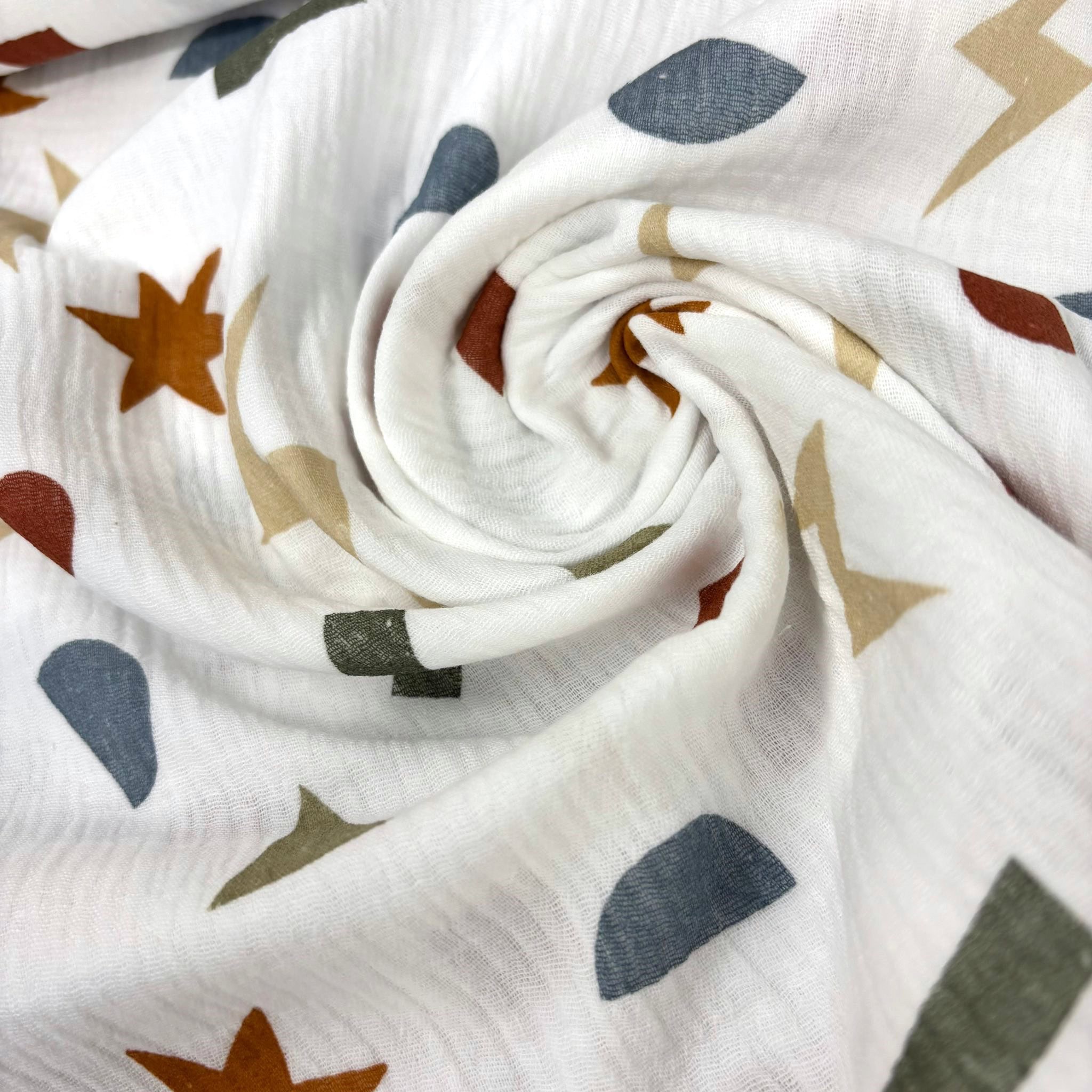 Tela de muselina o de doble gasa de algodón 100%. Viene con un estampado geométricos de estrellas, truenos y semicírculos en colores tierra y fondo blanco.