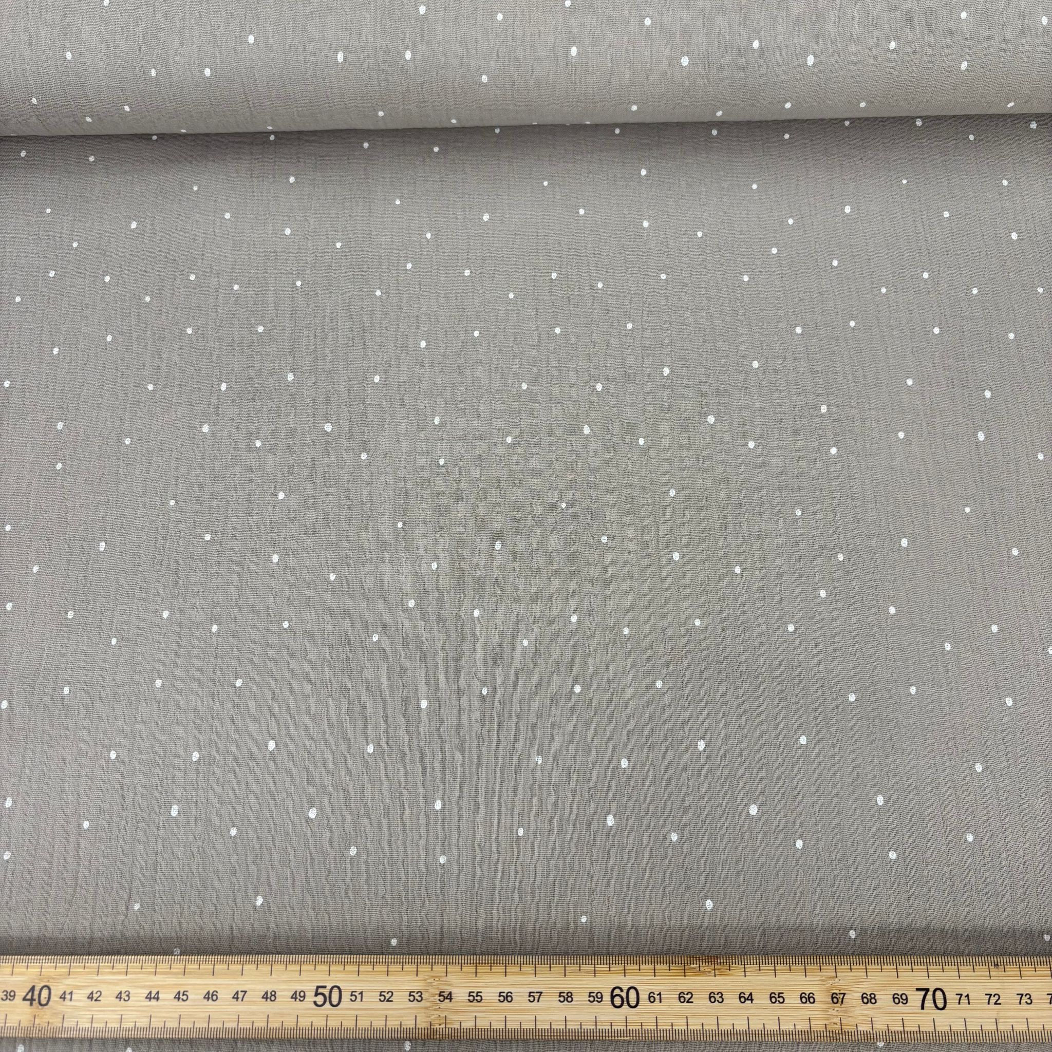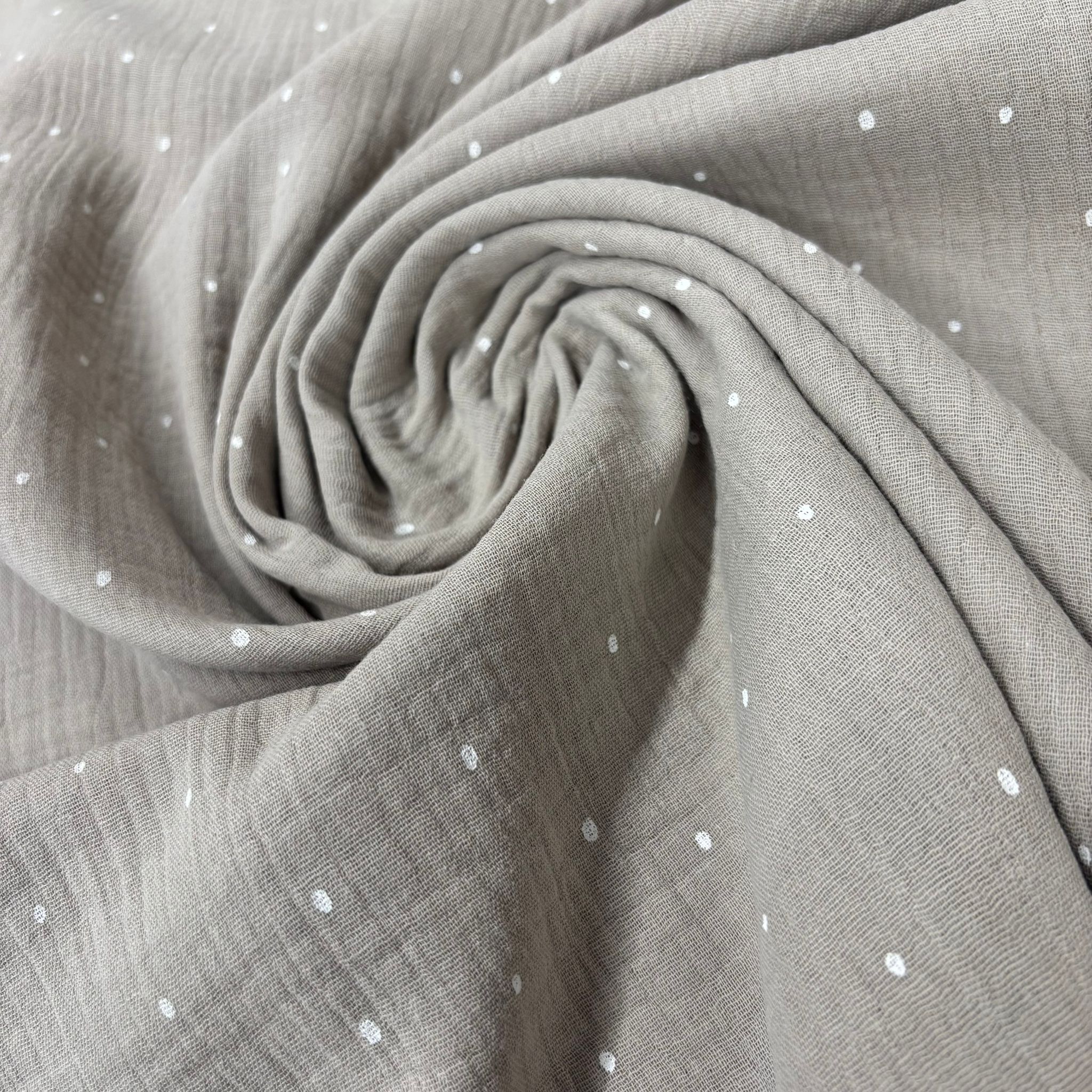 Tela de muselina o de doble gasa de algodón 100%. Viene con un estampado de puntitos o topitos pequeños en blanco y fondo taupé.