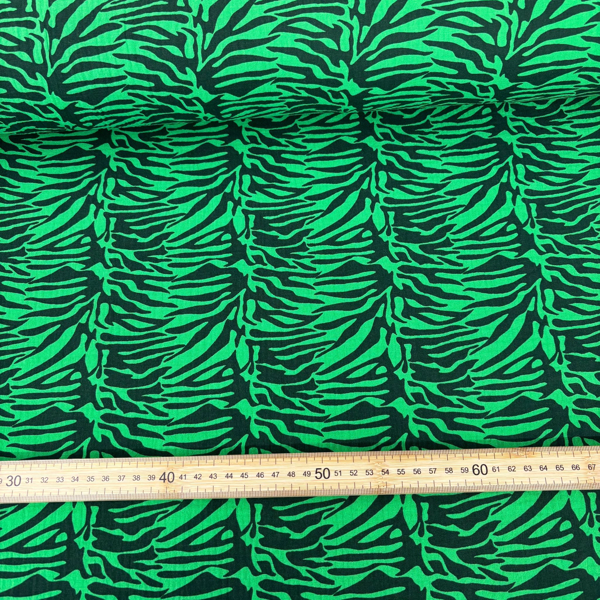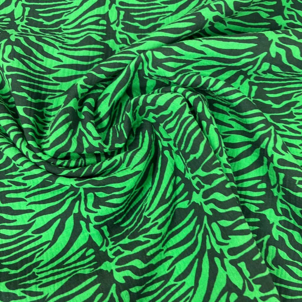 Tela de muselina o de doble gasa de algodón 100%. Viene con un estampado de animal print de zebra en tonos verdes vivos.
