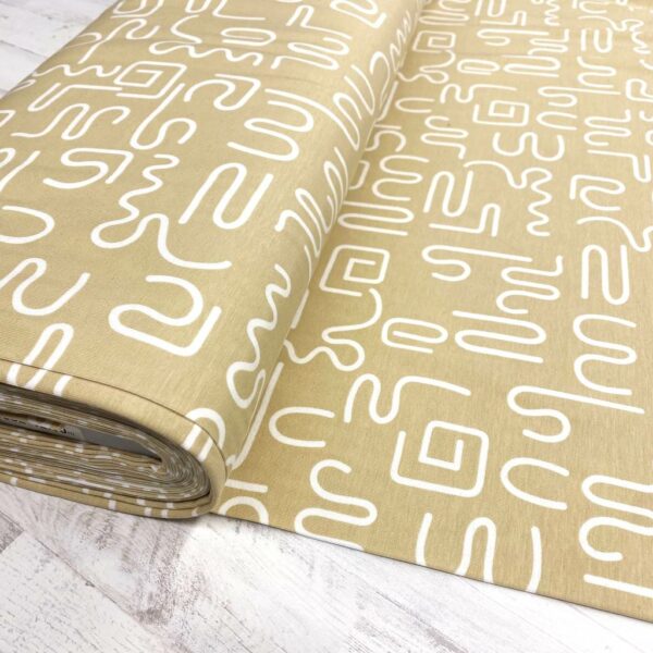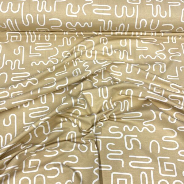 Tela de punto de camiseta de algodón estampado, tipo Jersey. Estampado con formas y garabatos en blanco fondo ocre. Tela compuesta por un 95% algodón y 5% elastán. Tejido de tacto muy agradable y elástico tanto a lo ancho como a lo largo.