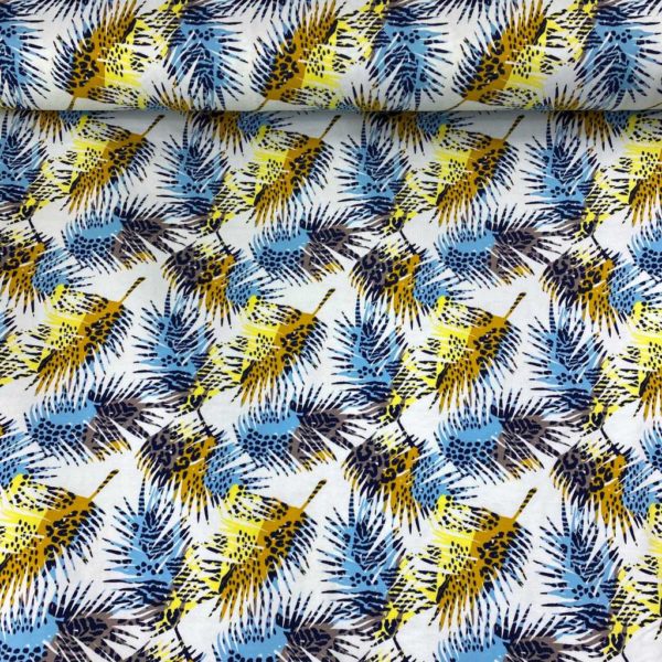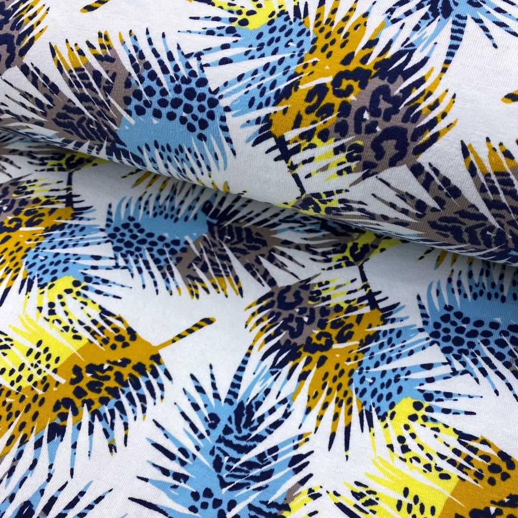 Tela de punto de camiseta de algodón tipo Jersey estampado con hojas de palmera de colores. Compuesta de 95% algodón y 5% elastano. Tejido de tacto muy agradable y elástico tanto en la anchura como en la largada.