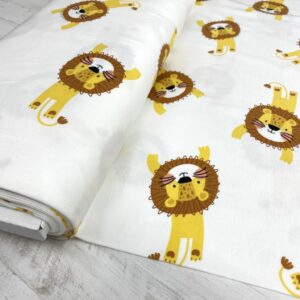 Tela de punto de camiseta de algodón estampado, tipo Jersey. Estampado con pandas y leones fondo blanco roto marfil. Tela compuesta por un 95% algodón y 5% elastán. Tejido de tacto muy agradable y elástico tanto a lo ancho como a lo largo.